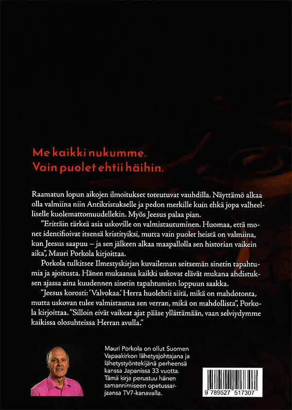 Raamatun lopunaikojen ilmoitukset toteutuvat vauhdilla. Näyttämö alkaa olla valmiina niin Antikristukselle ja pedon merkille kuin ehkä jopa valheelliselle kuolemattomuudellekin. Myös Jeesus palaa pian. ”Erittäin tärkeä asia uskoville on valmistautuminen. Huomaa, että monet identifioivat itsensä kristityiksi, mutta vain puolet heistä on valmiina, kun Jeesus saapuu – ja sen jälkeen alkaa maapallolla sen historian vaikein aika”, Mauri Porkola kirjoittaa.